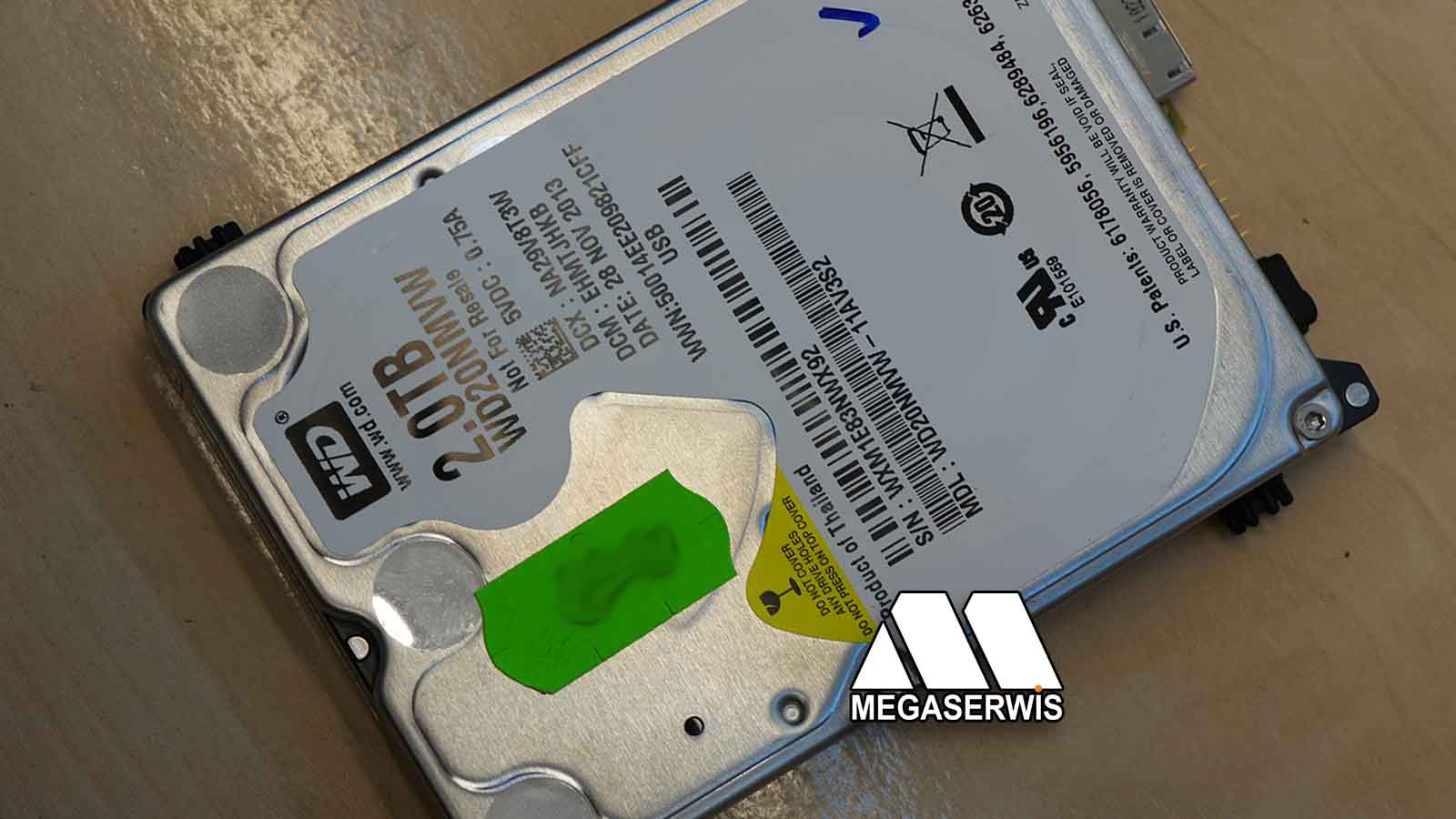 Po zdjęciu plastikowej obudowy wewnątrz był zainstalowany 2TB dysk WD20MNVW. Na podstawie opisu objawów już na etapie przyjęcia można było podejrzewać uszkodzenie zespołu głowic lub problem z parkingiem głowic. Tego typu dźwięki w dyskach HDD często wskazują na brak możliwości prawidłowego odczytu danych serwisowych z powierzchni talerzy. Tym razem głowice obijały się o parking i nie mogły w ogóle wejść nad powierzchnię talerzy, co tak naprawdę okazało się zbawienne dla całej sytuacji.